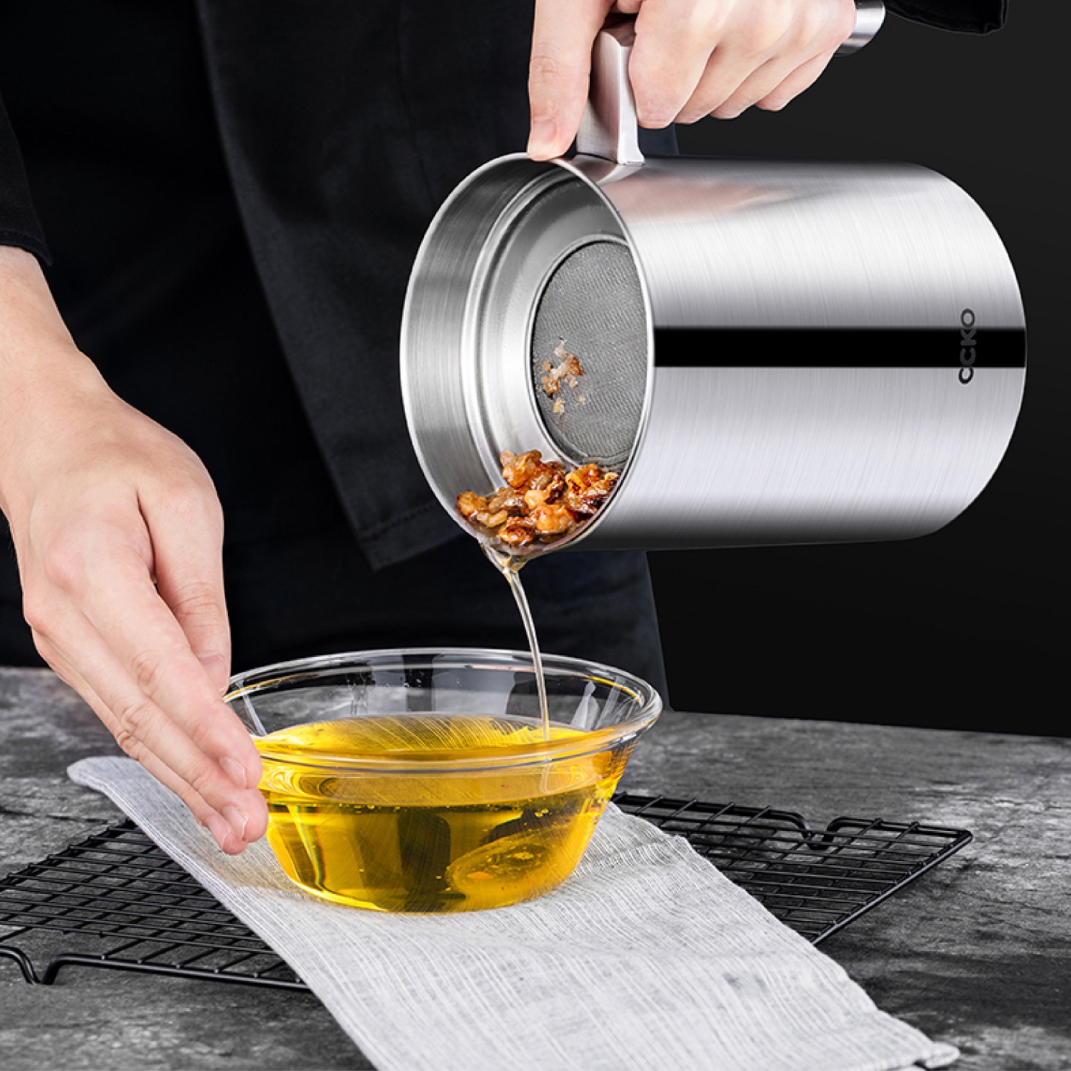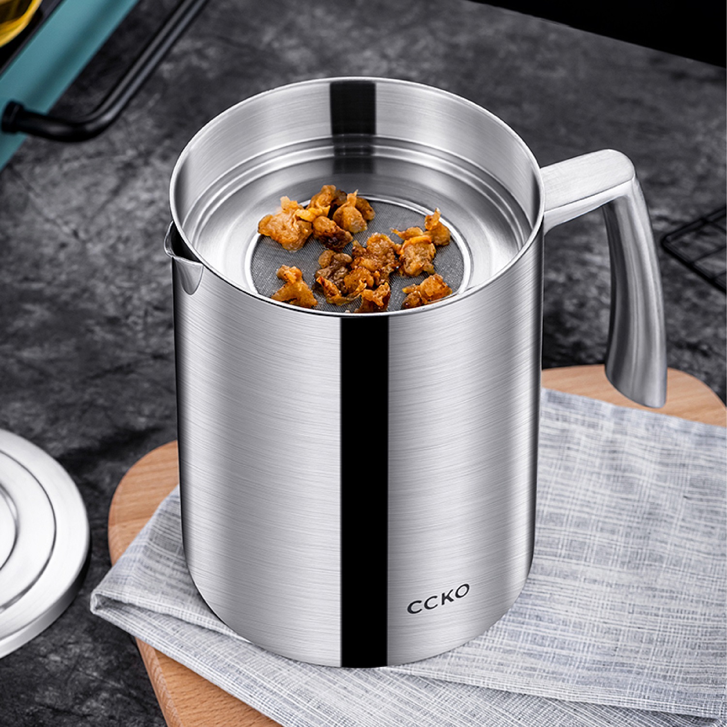 Ca lọc dầu mỡ bằng inox CCKO CK9962 cao cấp, dung tích 1200ml, có lưới lọc để tách dầu và cặn, đảm bảo an toàn và dễ dàng vệ sinh