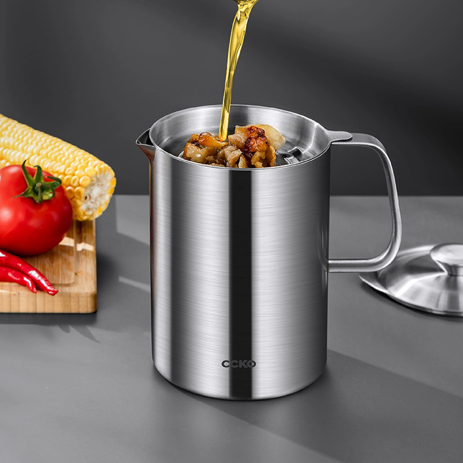 Ca lọc dầu mỡ bằng inox CCKO CK9962 cao cấp, dung tích 1200ml, có lưới lọc để tách dầu và cặn, đảm bảo an toàn và dễ dàng vệ sinh